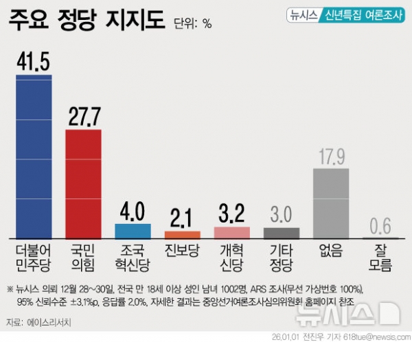 [뉴시스] 정당 지지도 민주 41.5%, 국힘 27.7%…석달전 대비 민주 동일, 국힘 1.3%p↓[에이스리서치]