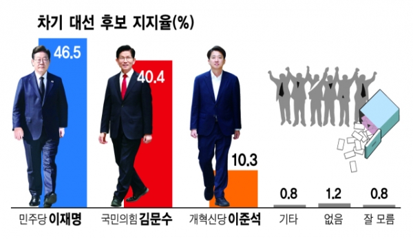 [강원일보·한신협 여론조사]이재명 46.5% 김문수 40.4% 이준석 10.3%[에이스리서치]
