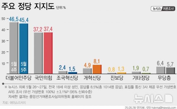 [뉴시스]민주당 45.4%·국민의힘 37.4%…민주 1.1%p↓, 국힘 0.2%p↑[에이스리서치]